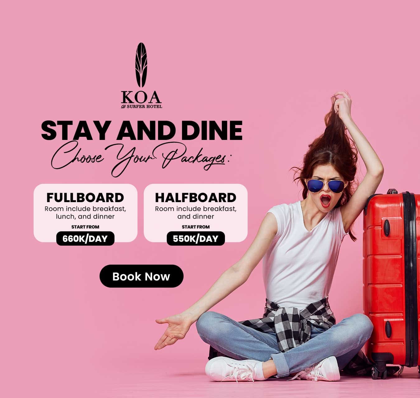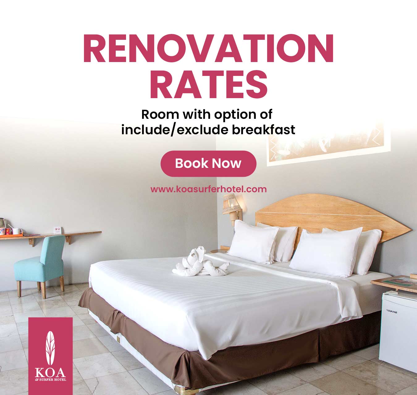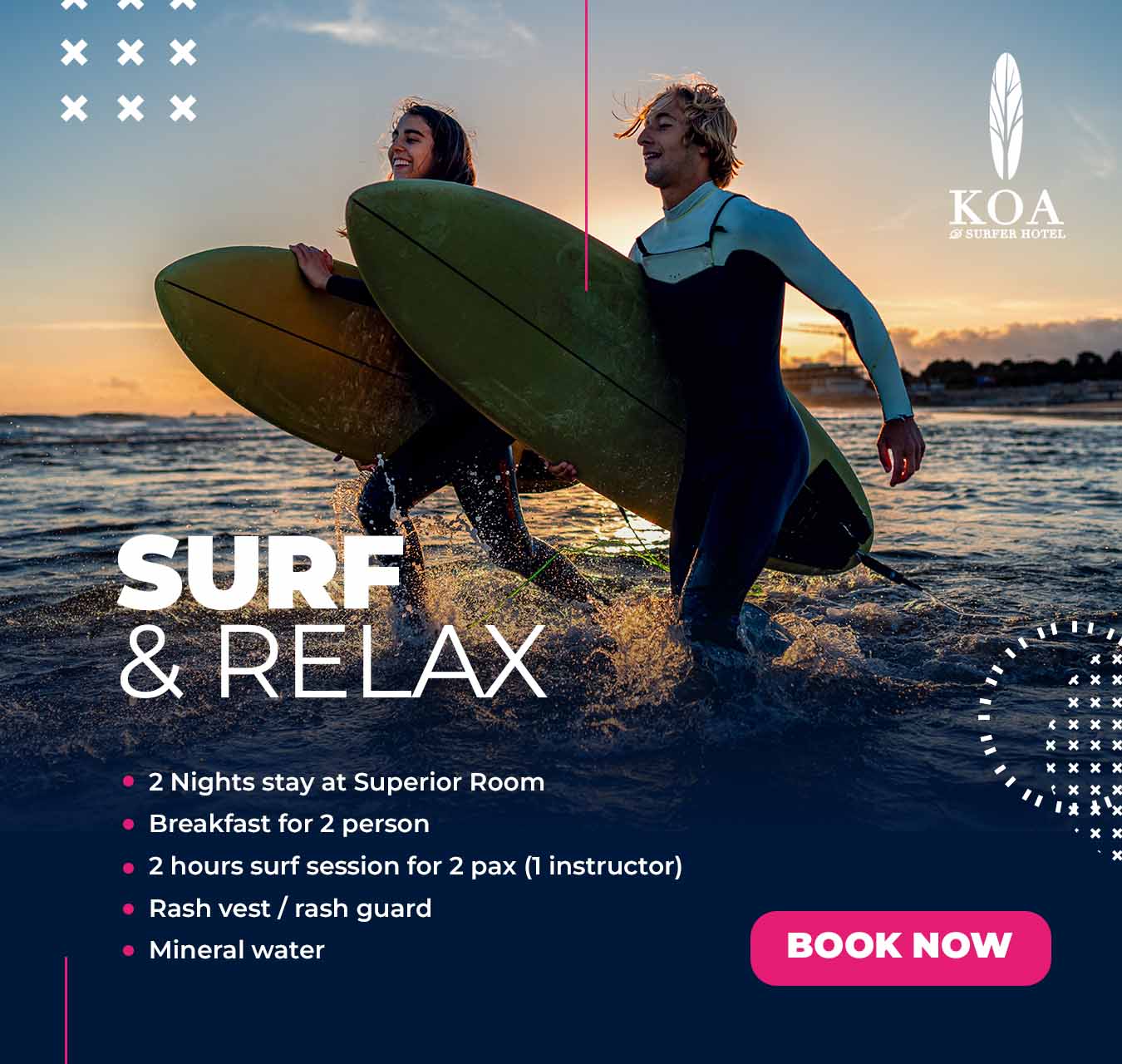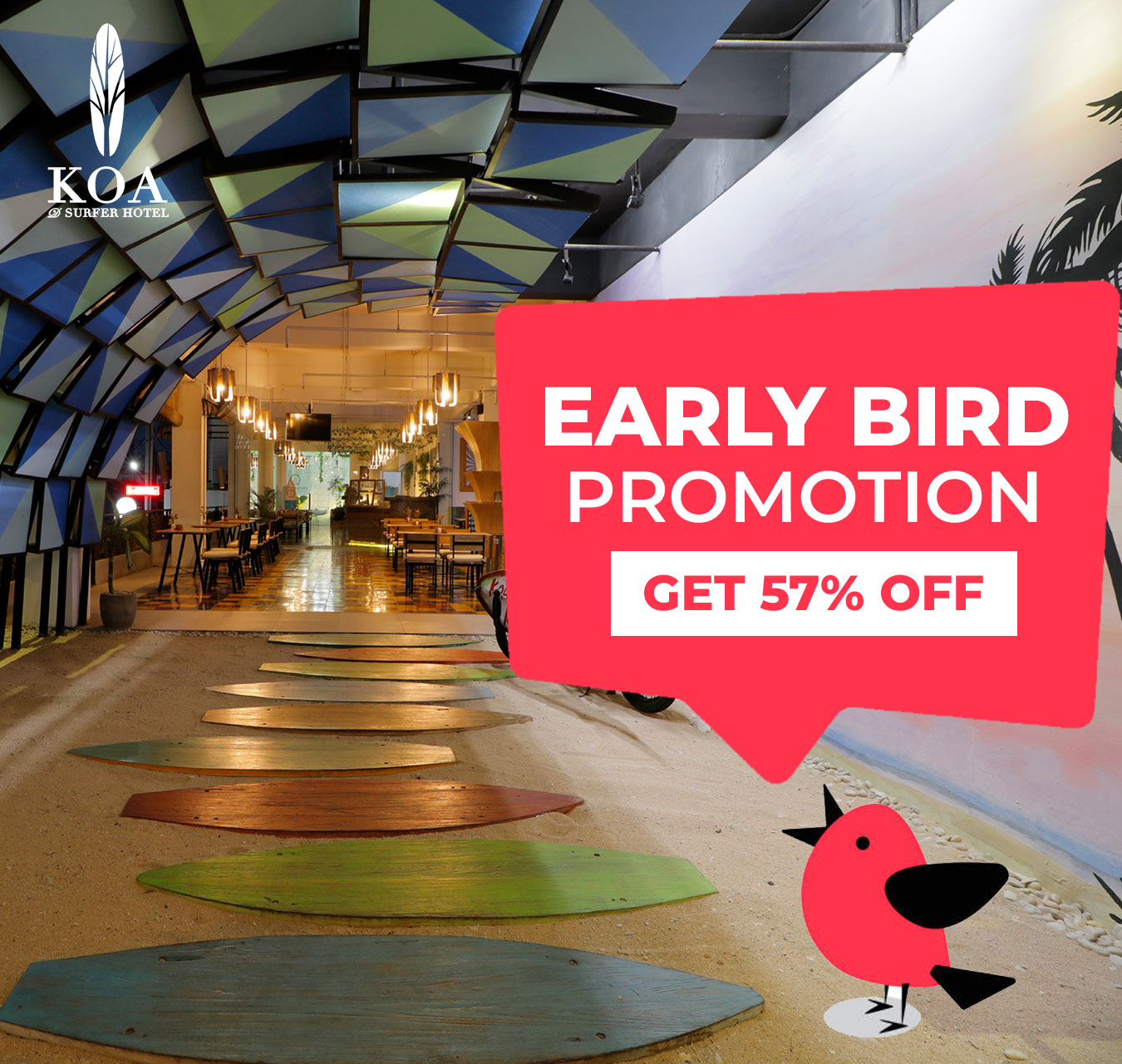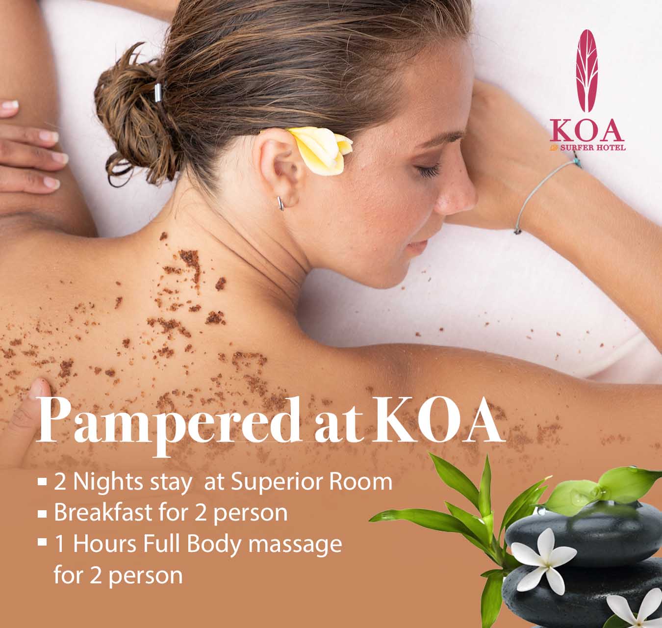 Canggu, home to two of Bali’s most famous beaches, Berawa and Batu Bolong, has a million things to offer you! KOA itself is located in the Berawa area (literally minutes away from Berawa Beach), so we’ve summarized some of ours and our guests’ fave things to do while in the area! Choose which yours : Full Board start from IDR 660K/day or Half Board start from IDR 550K/day. Relax, stay, and savor every moment. The rate include daily mineral water & Free WiFi During our Hotel renovation, we have best offers for you. Choose your date and get the Renovation rates. The rate include daily mineral water, Free WiFi, Free access to Rooftop Pool. Book now and get special 55% discount from our Best Available Rate Weekend is Yours. Get lowest rate ever on weekend. Minimum 1 night stay, choose your date on weekend and you got the promo! The rate include daily mineral water, Free WiFi, Free access to Rooftop Pool. Whats a best way to recharge your body? lets do the full body massage. Benefits of massage Massage is generally considered part of integrative medicine. It’s increasingly being Book your vacation EARLY & get rewarded at KOA D’SURFER HOTEL, at 30 days in advance with the Early Bird Advantage and enjoy 57% OFF our Best Available Rate! LET’S CHASING THE WAVE! 2 Night Stay. Its perfect deal for you who’s need only stay 2 night. Select the date and you got the promo! The rate include daily mineral water, Free WiFi, Free access to Rooftop Pool. Canggu, Being the hippest place in the world at the moment, is heaven for surfers and all travelers to come visit again and again. Why Canggu? Well, why not? We have many amazing surf board makers Get special discount if you stay minimum 3 nights OUR SPECIAL OFFRES
